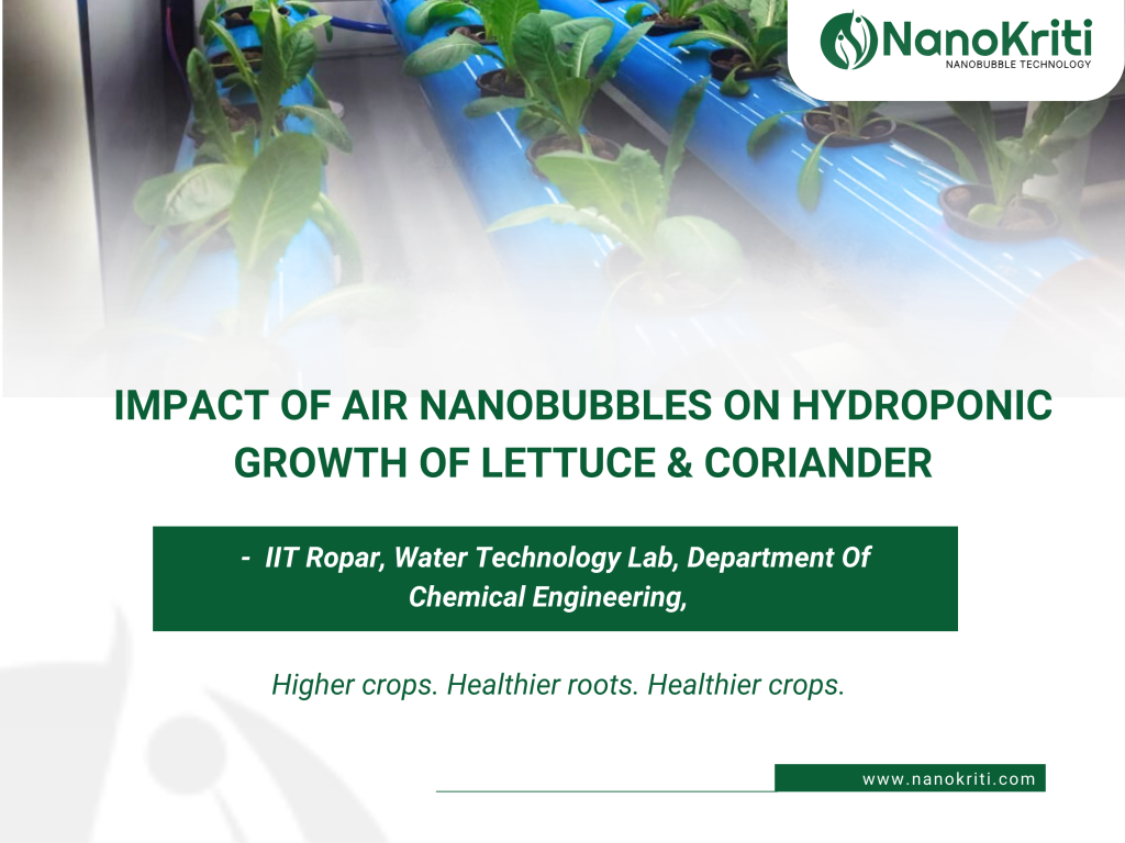 Water Technology Lab, Department Of Chemical Engineering, IIT Ropar. Hydroponic systems depend heavily on dissolved oxygen levels for efficient plant growth. In this study, air nanobubbles generated using NanoCloud by Nanokriti were introduced into the nutrient solution to improve oxygen availability and evaluate their impact on crop performance. The results showed clear improvements across both […]